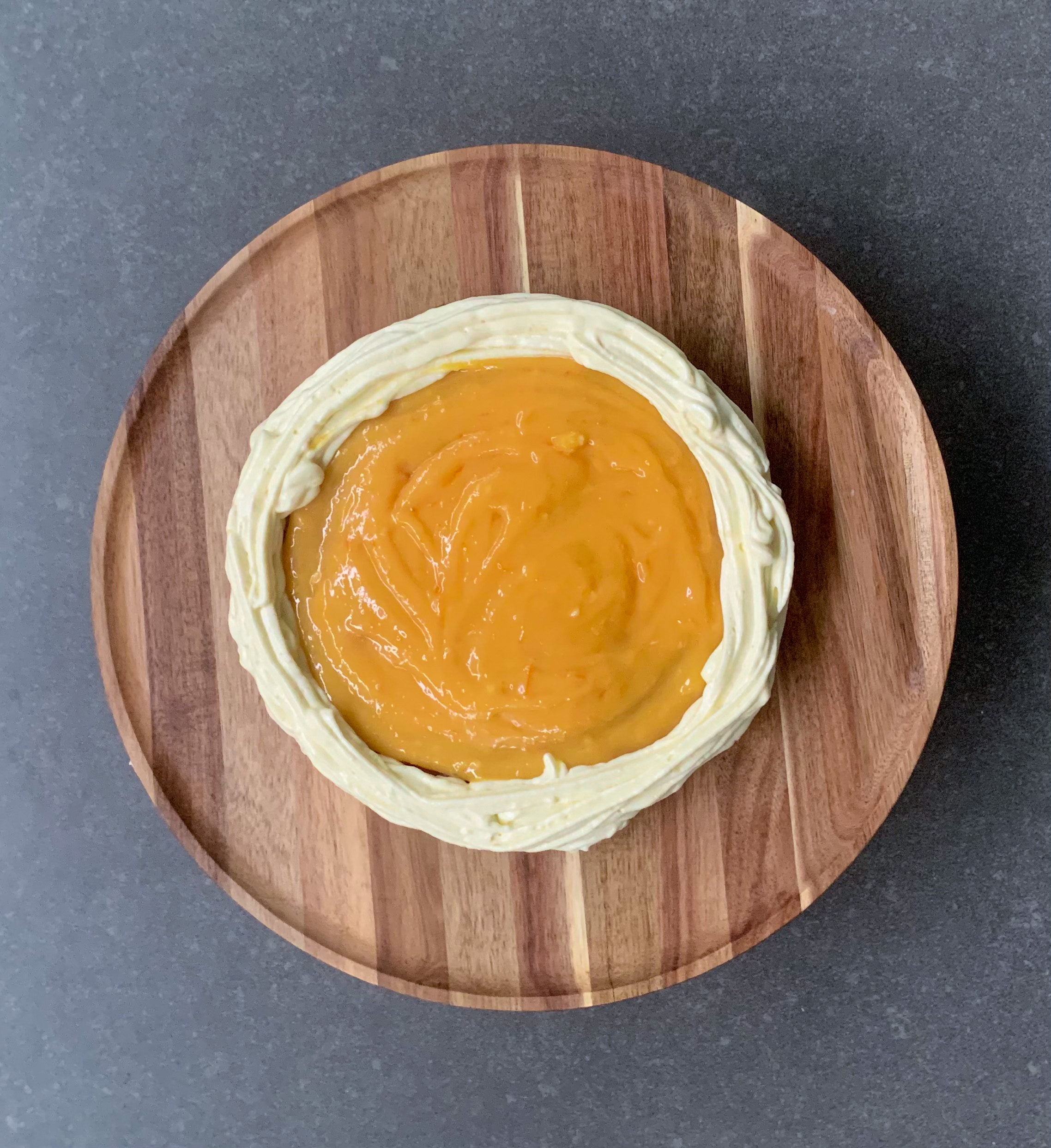 In het recept staat een beschrijving van hoe je de taart moet opbouwen. Eerst de cake, aan de zijkantjes de botercrème, in het midden de curd en dan weer een cake etc. Omdat ik snap dat dit wel een beetje verwarrend kan zijn, heb ik speciaal een foto gemaakt van hoe mijn cake eruit opbouw eruit zag. Zie hier: